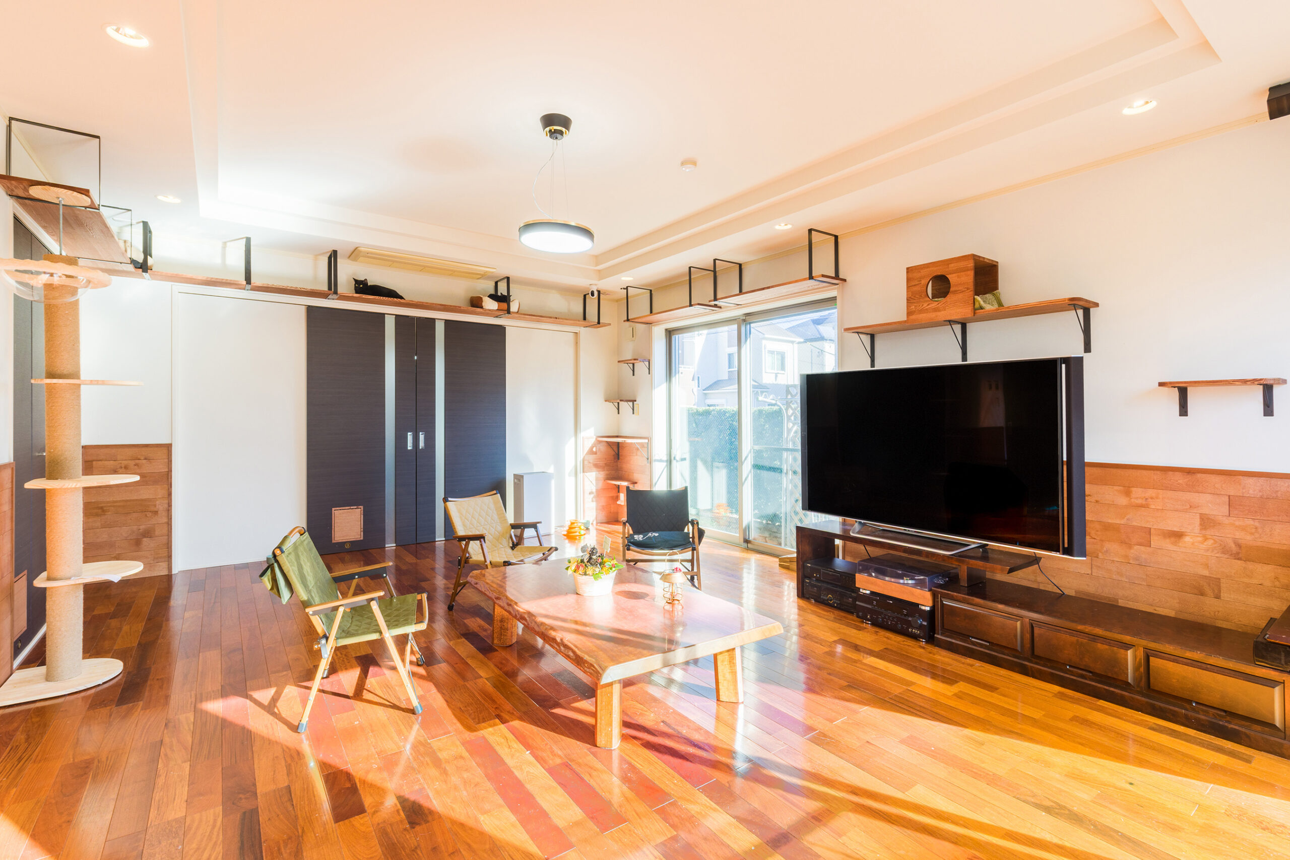 マンションオーナー様のワンフロアを地域猫施設としてリフォーム。保護されているねこちゃんたちが、新しい飼い主さんと出会うまで仲間たちと楽しく暮らせるよう、キャットウォークや脱走防止玄関・ねこ専用テラス(キャティオ)など施工しました。